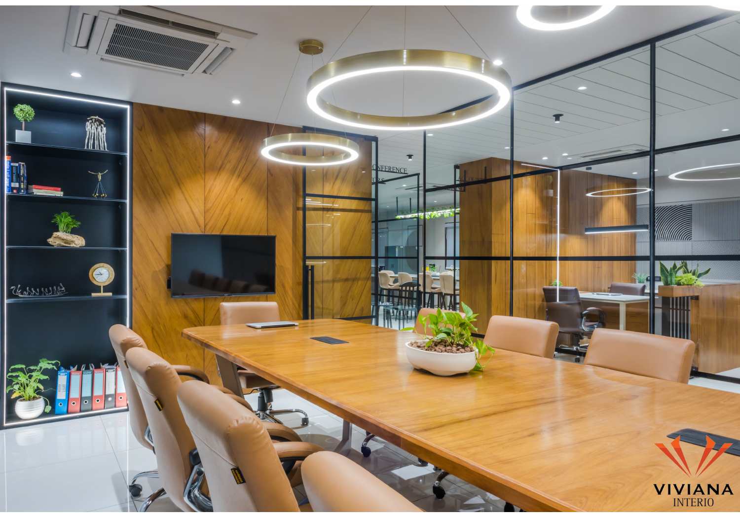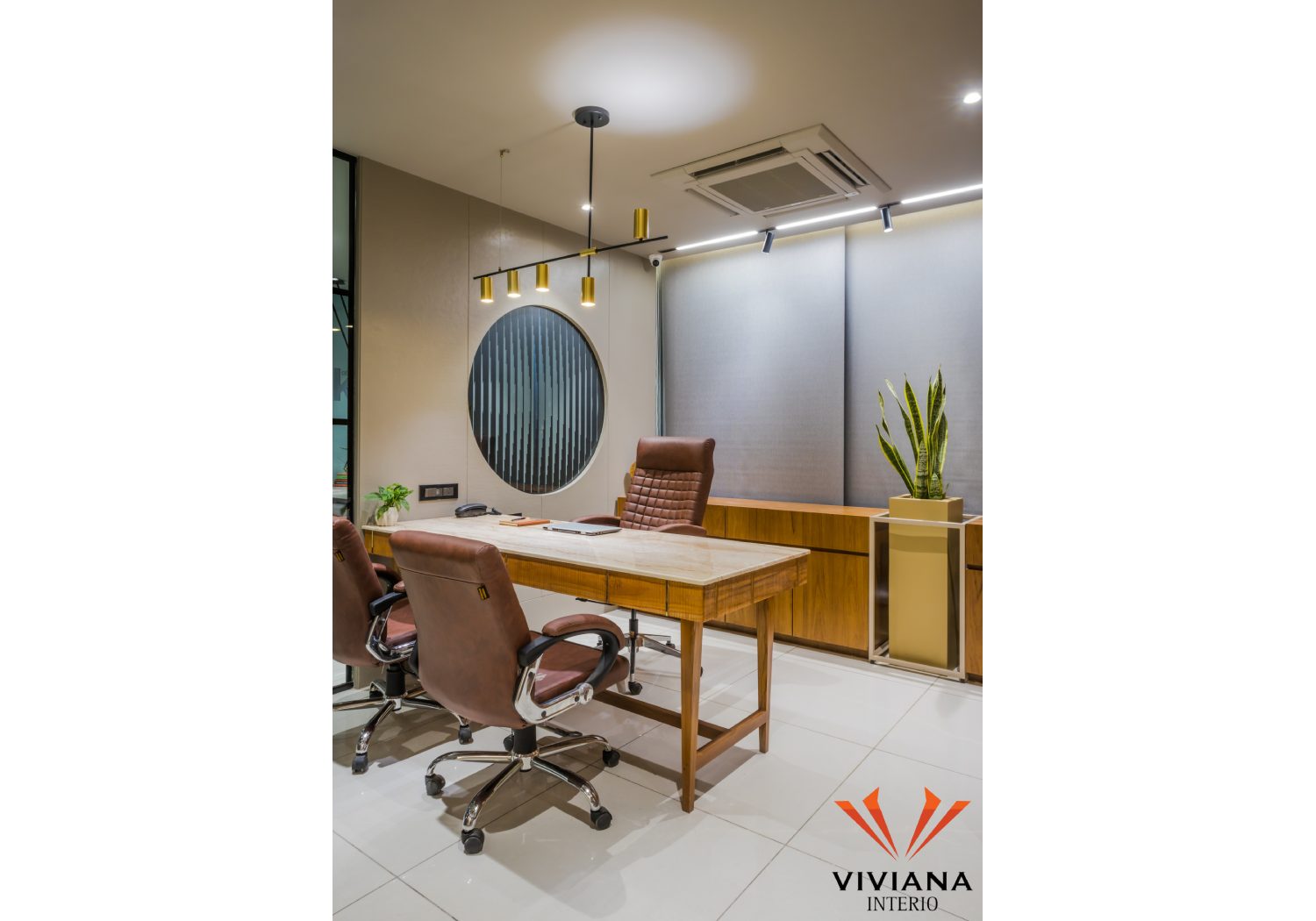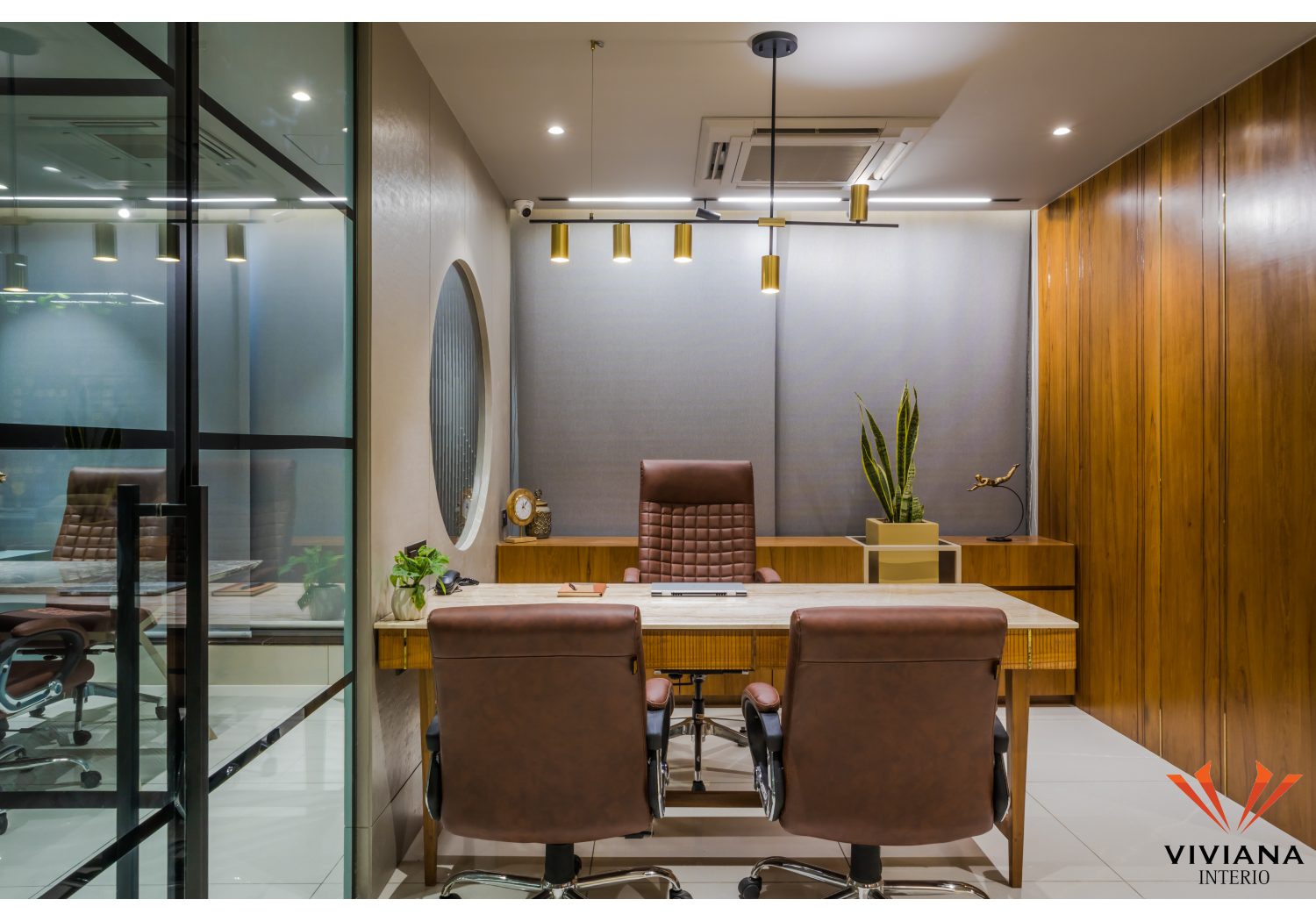 The master cabin is fixed with the profile glass door. The cabin uses veneer with brass details furniture. The discussion table consist of rough wood and brass detail with Italian stone top. The backdrop uses roman blinds and metal CNC. The round metal CNC was designed keep in mind the visual view span from the reception to the dining area.